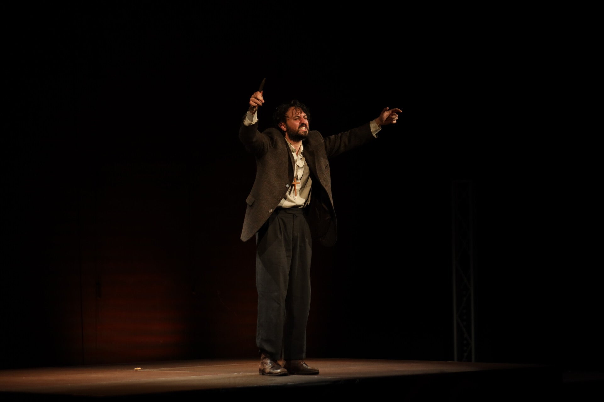 À travers des formes d’expression variées, le spectacle dévoile un romancier marqué par la folie suite à son expérience traumatisante de la guerre, aggravée par sa captivité. Il doit alors faire face au conflit interne entre le réel et l’imaginaire, entre le héros et l’anti-héros. Cette dualité mènera à la désintégration de son monde.
